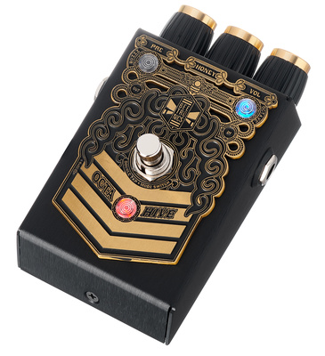Beetronics Octahive V2, Effect Pedal for Electric Guitar, High Octave Fuzz, Inspired by legendary Octave Fuzz pedals of the 70s, Successor of the Beetronics Octahive, Vintage sounds with modern features, 2 Switchable modes: buzz and octave, Buzz mode: high-gain fuzz for deep riffs and powerful chords, Octave mode: psychedelic high-octave fuzz, Controls: Pre (pre-gain), Honey (gain), Volume, Multifunction footswitch: bypass and change modes, Pressing the bypass switch twice toggles between modes and holding the bypass switch temporarily switches to the other mode, 3 Footswitch profiles to adjust the temporary switching speed: fast (20 ms), medium (100 ms), lazy (250 ), Saves the last state before switching off (mode, profile), Two LEDs to indicate the active mode, Input and output: 6.3 mm mono jack, Power consumption: 50 mA, Power supply via 9 V DC mains adapter, negative pole inside (not included – suitable mains adapter: art: #409939#), Dimensions: 11.4 x 6.4 x 5.7 cm, Handmade in California, USA