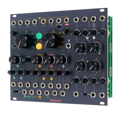 Elke oscillator is voorzien van grof- en fijnafstemming, lineaire en exponentiële FM-ingang met attenuator en 4 waveform-uitgangen.De groene oscillator kan zelfs worden gebruikt als LFO voor nog meer creatieve opties.Daarnaast beschikt de Brenso over een nieuw ontwikkelde CV-bestuurbare waveshaper/wavefolder, waarmee je geluiden kunt vormgeven op een unieke manier.
